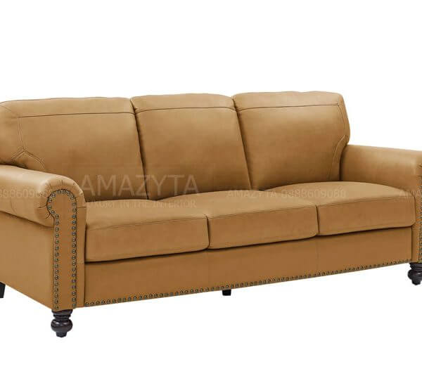 Với thiết kế cổ điển tối giản, mẫu ghế sofa này có mặt lưng và mặt ngồi được thiết kế phẳng và trơn, tạo nên một phong cách đơn giản nhưng không kém phần sang trọng. Tay ghế dạng cuộn có đính đinh đồng quanh viền tạo điểm nhấn cổ điển cho ghế.
